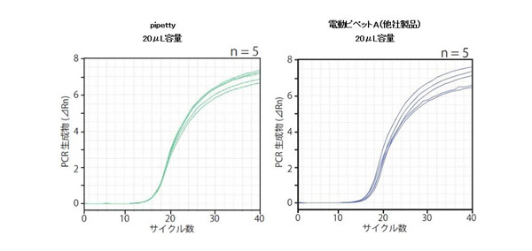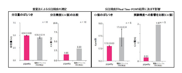 在比較電動移液器和手動移液器時,主要區(qū)別之一是“連續(xù)分配”功能。 可以將設(shè)定的移液量重復(fù)多次排出,從而提高了工作效率。 特別是,“Pipetty”保證了連續(xù)的移液精度,并且與其他公司的移液器相比,其測試結(jié)果的差異也非常小。 因此,Pipetty是最適合PCR分析的移液器,因為移液器的分配精度對檢測結(jié)果有很大的影響。