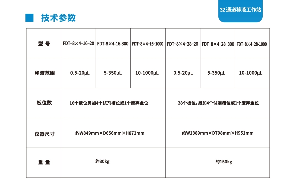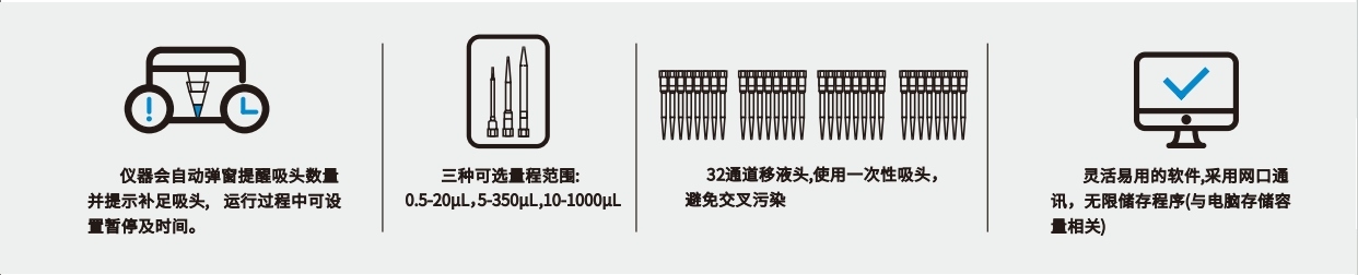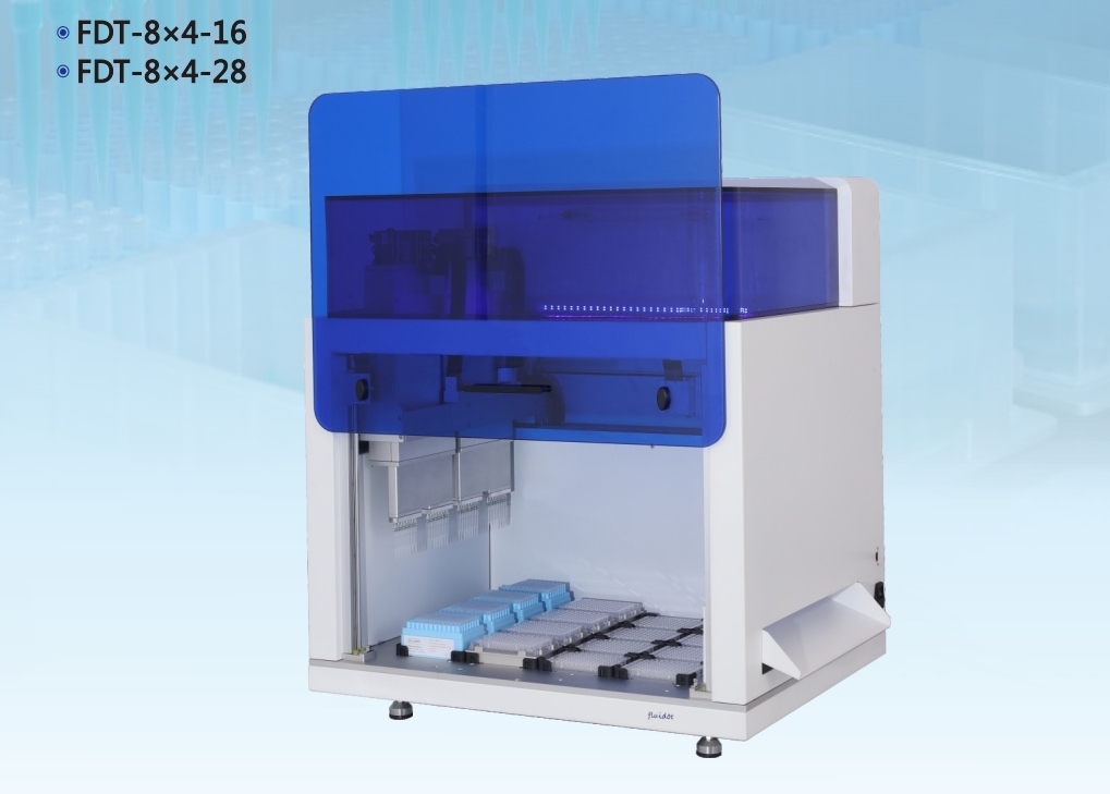 四個(gè)8通道移液頭的多功能移液工作站,擁有兩個(gè)系列產(chǎn)品:FDT-8X4-16與FDT-8x4-28,分別為16板位與28板位,每個(gè)系列有0.5-20μL、5-350μL、10-1000μL等多個(gè)量程可供選擇,可實(shí)現(xiàn)1-32通道的移液,可以自動(dòng)退吸頭,比8通道的移液效率快4倍,軟件操作系統(tǒng)圖形化界面,直觀簡(jiǎn)單,廣泛應(yīng)用于血凝實(shí)驗(yàn)(HA)、血凝抑制實(shí)驗(yàn)(HI)、藥物篩選與藥物敏感實(shí)驗(yàn)、抗體篩選、樣本轉(zhuǎn)移、核酸純化提取、各種試劑體系配制等場(chǎng)合。